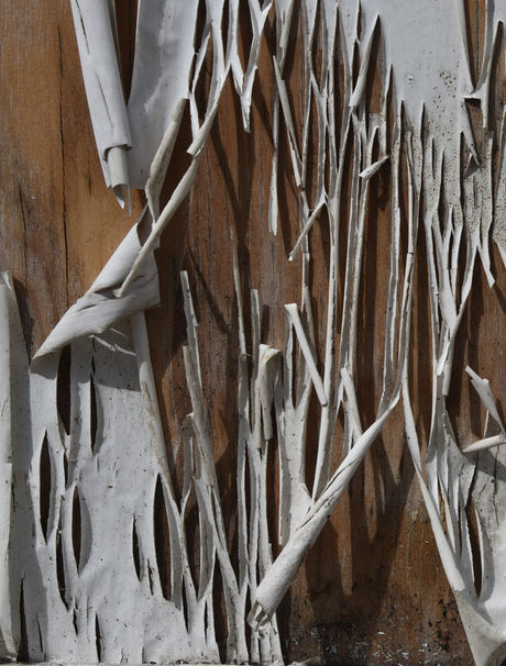 The fence was in a station car park in a surrey village. It was surrounding a large building site alongside the car park. I was taken by the hap hazard arrangement of the vertical peeling forms set against the grain of the dark plywood surface.